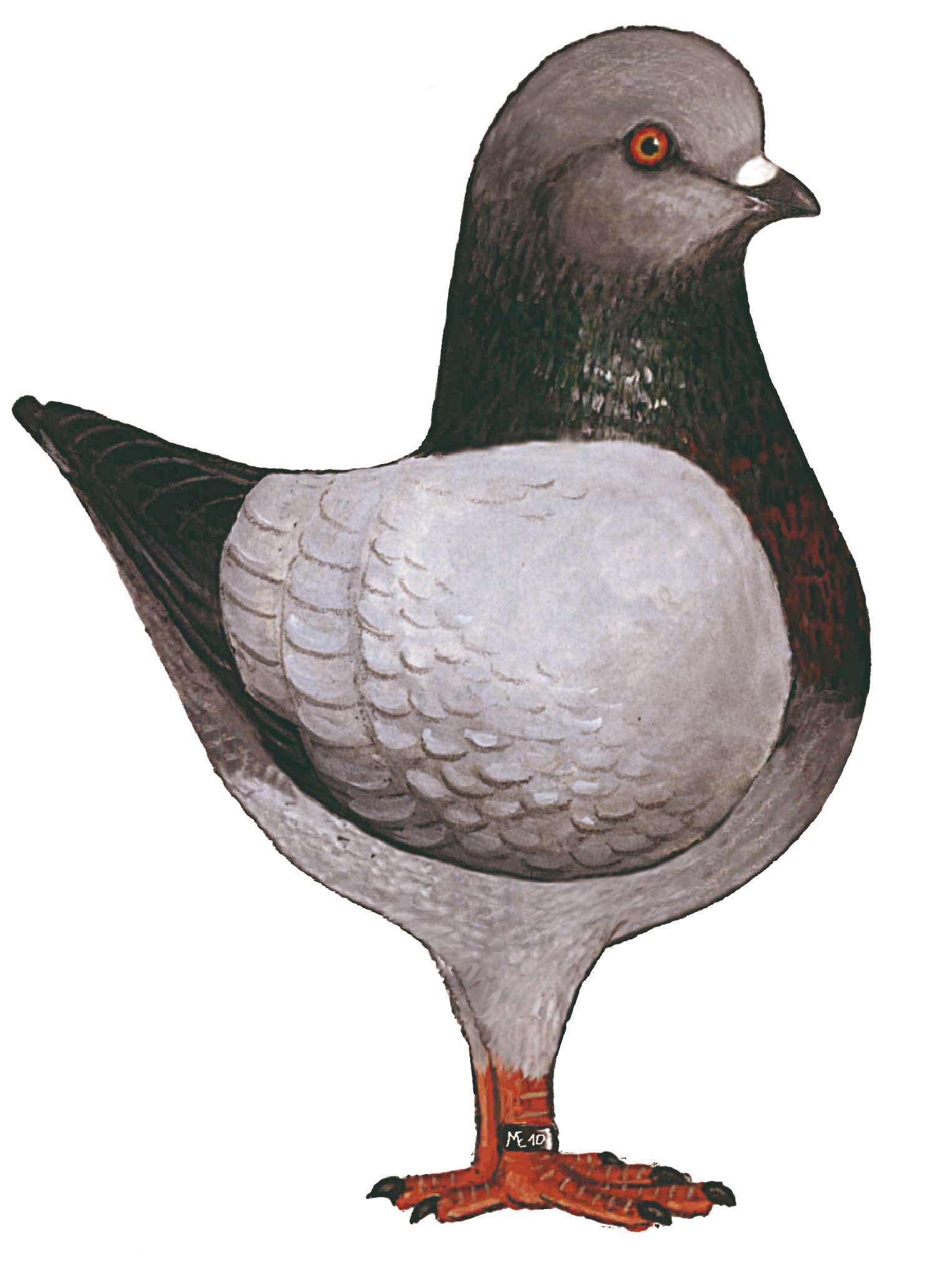 polni sijaj nebeško modre barve. Vrat ima od temno do svetlo zeleni sijaj. Na trtici je zaželena modra barva, a je dovoljena tudi bela barva. Golob je modro obarvan po glavi, nogah in trebuhu. Letalna peresa in konica repa so črni. Kakor že ime pove, na krilih ni podvezice. |