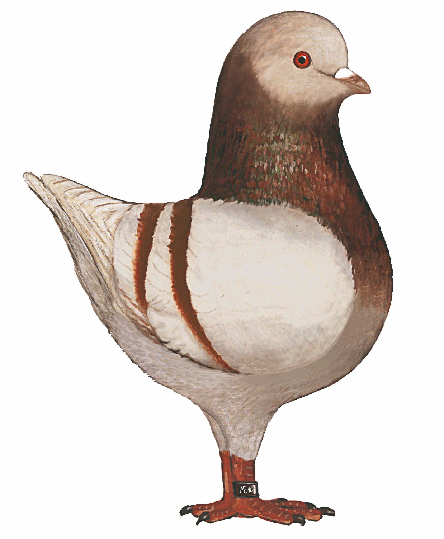 polni sijaj bledo rdeče barve. Po vratu je metalno zelenkasti sijaj. Na krilih sta dve podvezici, ki rahlo zavijata v obliki črke V in se približno 2,5 cm od konca krilnega pokrova na koncu krila skoraj spajata. Temen rep ni dovoljen. Vrat, prsi in podvezice so enako rdeče barve. Rdeče ali rjavkaste pege so dovoljene na krilno letalnem ter repnem perju. Na trtici je zaželena pepelasto siva barva, dovoljena pa je tudi sivo srebrna.