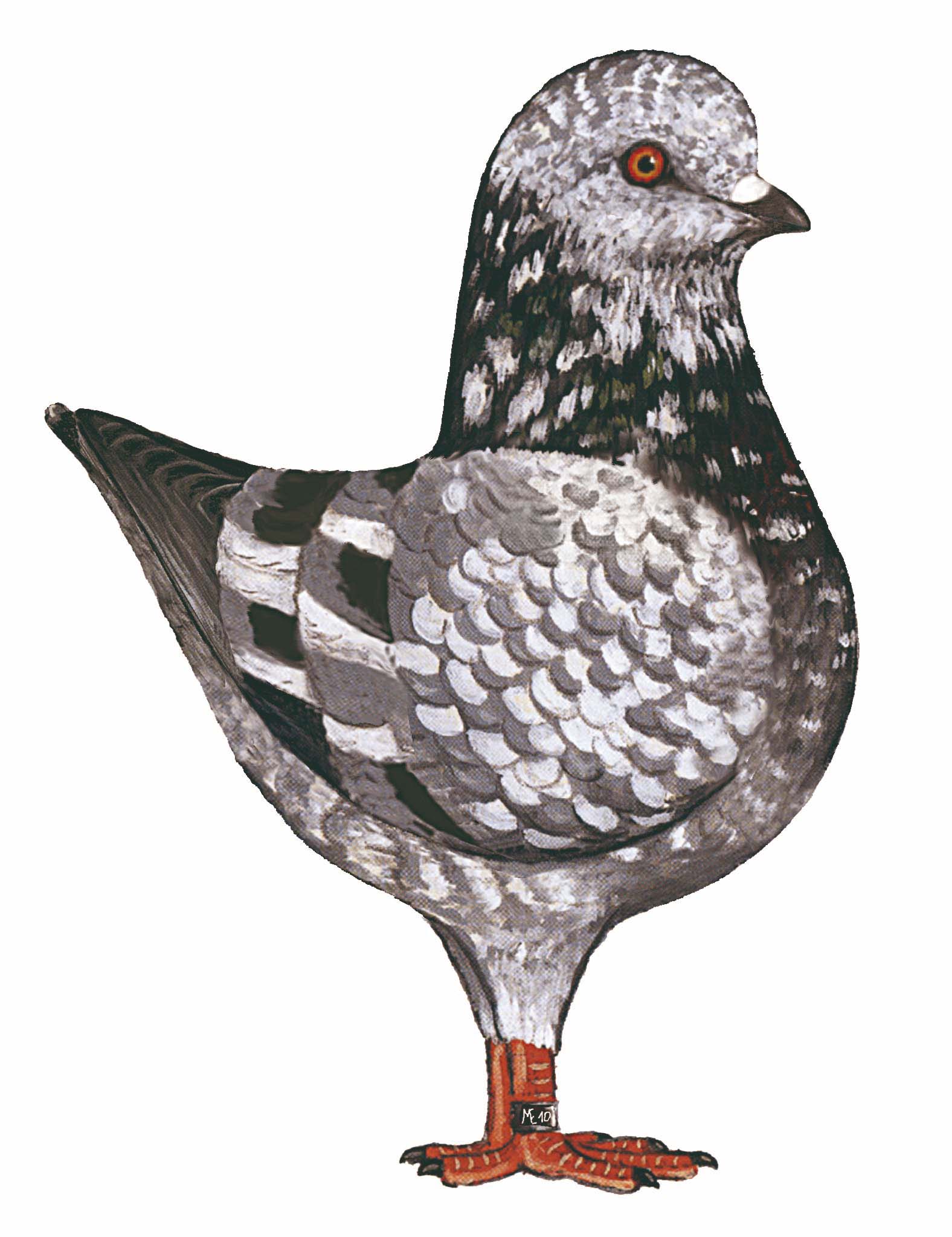 polni sijaj nebeško modre barve. Vrat ima od temno do svetlo zeleni sijaj. Krila imajo dve dobro omejeni podvezici, ki rahlo zavijajo v obliki črke V po celem pokrivalu krila. Progi morata biti črne barve, približno 2,5 cm od dna krilnega pokrovca s tem, da se na kraju kril skoraj dotikata. Rep in krila so brez bele barve. Belo perje je po krilih, glavi, oz. po telesu. |