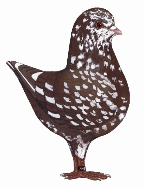 osnovna barva je kostanjevo rdeča z enakomerno porazdelitvijo belega perja. Tudi v krilu in repu se morajo rdeča in bela peresa izmenjavati. Rejci za ta barvni učinek nujno potrebuje potrpežljivost in doslednost za doseganje določenega napredka. |